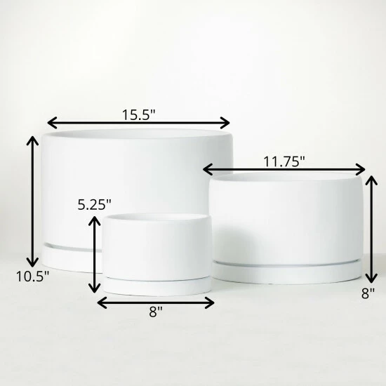 - Planters measure 15.5″L x 15.5″W x 10.5″H; 11.75″L x 11.75″W x 8″H; 8″L x 8″W x 5.25″H