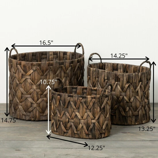 - Baskets measure 13.5″L x 13.25″W x 14.75″H; 14.25″L x 10″W x 13.25″H; 12.25″L x 8.25″W x 10.75″H
