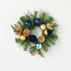 Embellished with rich blue & shimmering gold ornaments, this decorative pine botanical is an eye-catching collection great for the holidays. Exclusive to Sullivans, lush faux greens are delightful accented with gold leaves, berries & pinecones, making this 15″ mini wreath an elegant option. Over the last 52 years, Sullivans has become an industry leader in home decorations. Our brand is rooted in tradition while incorporating modernized trends to keep your home looking up to date with timeless style. Here at Sullivans, we pride ourselves on creating product designs focused on quality and value, ensuring that our customers have access to beautiful products at reasonable price points.