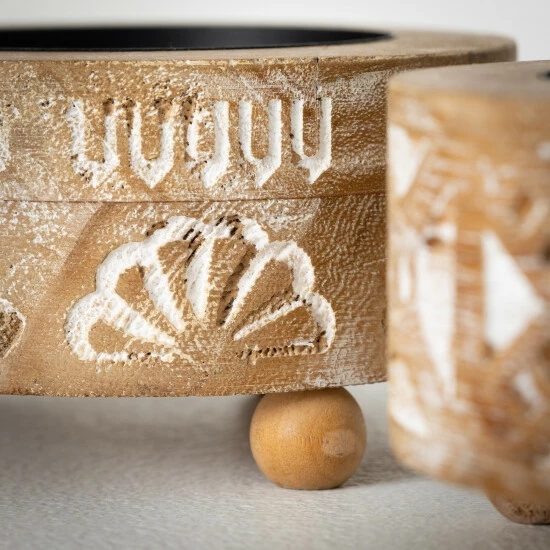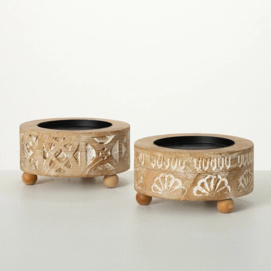 Take your pillar display to new heights with this pair of warm brown wooden risers. Elevating your favorite candles, this set is accented with feet for added stature. The chiseled look adds to the eclectic charm this duo provides. Over the last 55 years, Sullivans has become an industry leader in home decorations. Our brand is rooted in tradition while incorporating modernized trends to keep your home looking up to date with timeless style. Here at Sullivans, we pride ourselves on creating product designs focused on quality and value, ensuring that our customers have access to beautiful products at reasonable price points.