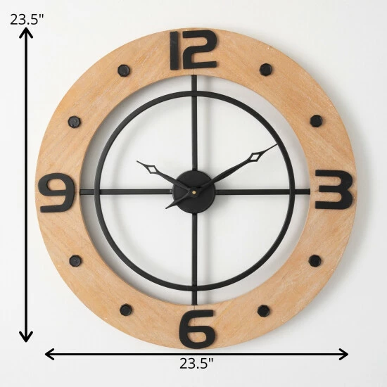 Bold and modern, wrapped into one functional wall piece, this clock is sure to make an artful and dramatic statement. A wide wooden circular band that creates a shape just under two feet wide, is accented with black metal embellishments for an eclectic flourish. Over the last 55 years, Sullivans has become an industry leader in home decorations. Our brand is rooted in tradition while incorporating modernized trends to keep your home looking up to date with timeless style. Here at Sullivans, we pride ourselves on creating product designs focused on quality and value, ensuring that our customers have access to beautiful products at reasonable price points.