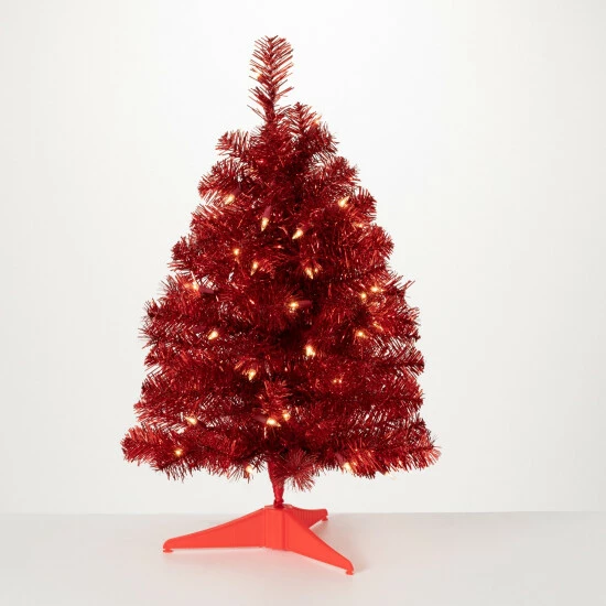 - Add this 25″ artificial lighted red tinsel tree to your decor this holiday season
