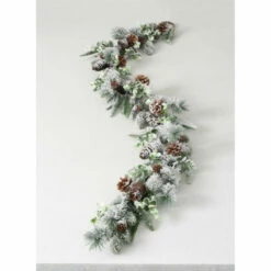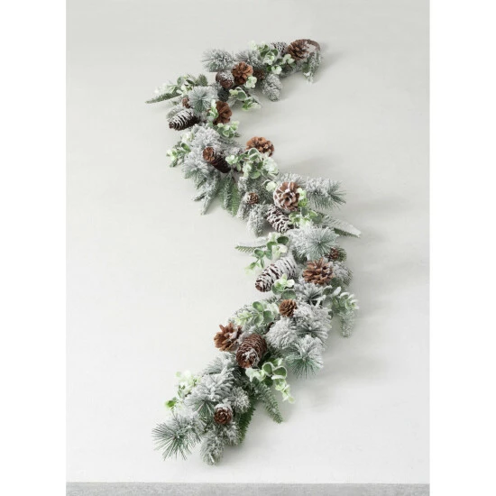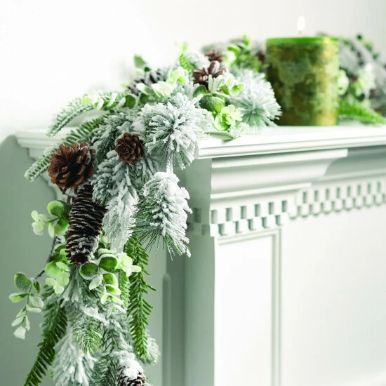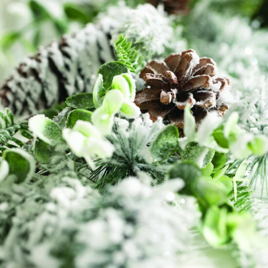 Flocked to total perfection, this snow-covered collection looks fresh from the outdoors. Every component of this beautiful compilation is layered in faux snow – the pine, the greens, the cones – and it all looks completely stunning. There’s plenty of texture and dimension to this array of greens.