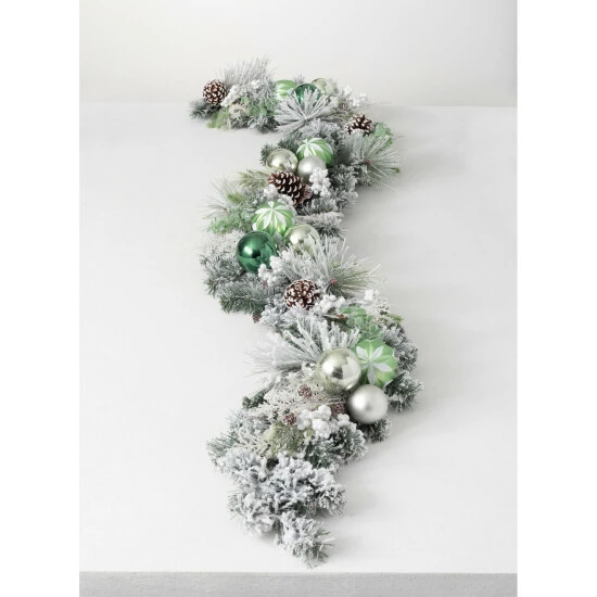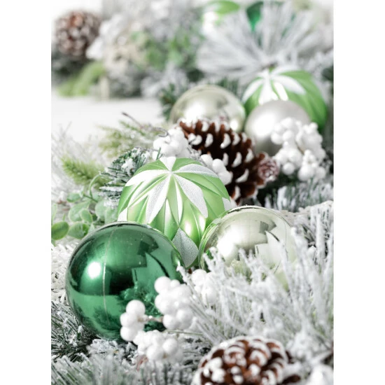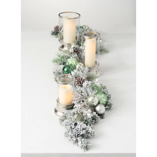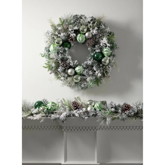 For those who like a little glitz and glam in their holiday decor, look no further that this stunning pine and ball collection. Lush, snow-covered pine and greens add a fullness to the overall look, complemented by pine cones and decorative Christmas bulbs.
