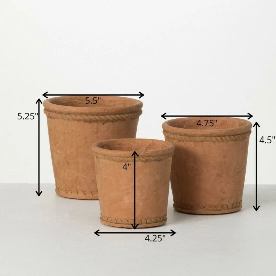 Add some flair to your garden projects with these unique planters. Each size is designed to fit perfectly in any personal or garden space. With rustic clay colors and detailed rope textures, these pots are made to go with any home garden project. Over the last 52 years, Sullivans has become an industry leader in home decorations. Our brand is rooted in tradition while incorporating modernized trends to keep your home looking up to date with timeless style. Here at Sullivans, we pride ourselves on creating product designs focused on quality and value, ensuring that our customers have access to beautiful products at reasonable price points.