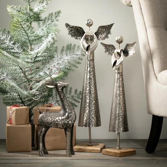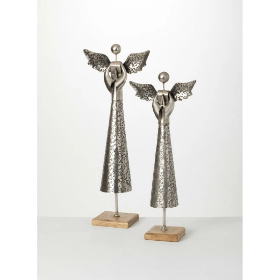 Standing tall, wings and all, this delightful duo of metallic angel figurines are sculpted in a modern and abstract silhouette. Three dimensional with intricate details, this pair stands 23″ and 26″ tall on their wooden slat supports.