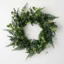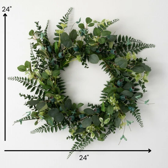- Hang this artificial green pod and foliage wreath on your front door for instant curb appeal