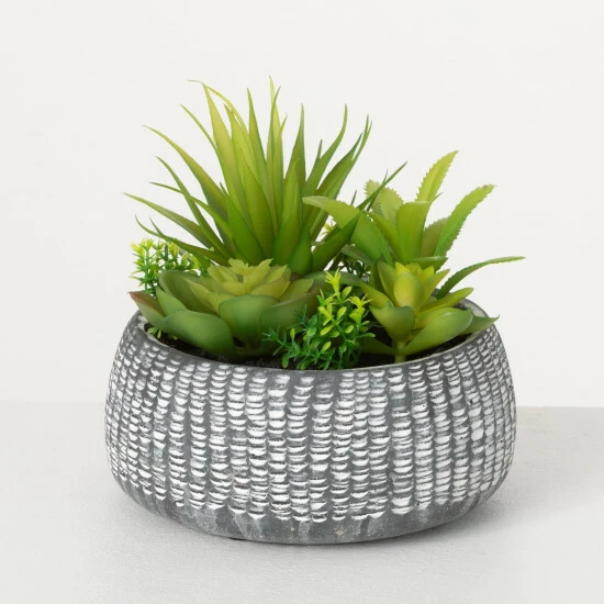 Add some life to your personal space with this beautiful succulent arrangement. With lush, natural greens and unique, geometric textured planter, these plants are perfect for any surface in your home. Over the last 52 years, Sullivans has become an industry leader in home decorations. Our brand is rooted in tradition while incorporating modernized trends to keep your home looking up to date with timeless style. Here at Sullivans, we pride ourselves on creating product designs focused on quality and value, ensuring that our customers have access to beautiful products at reasonable price points.