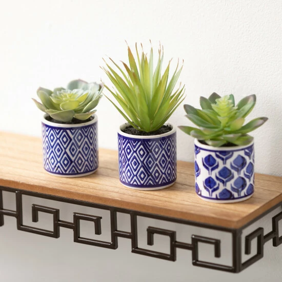 Featuring a colorful contrast that really brings on the drama, this trio of blue and white patterned pots is artfully filled with three different succulents. The perfect collection for a windowsill or resting on a bookshelf, this clever collection doesn’t require water, light or any attention at all. Over the last 52 years, Sullivans has become an industry leader in home decorations. Our brand is rooted in tradition while incorporating modernized trends to keep your home looking up to date with timeless style. Here at Sullivans, we pride ourselves on creating product designs focused on quality and value, ensuring that our customers have access to beautiful products at reasonable price points.