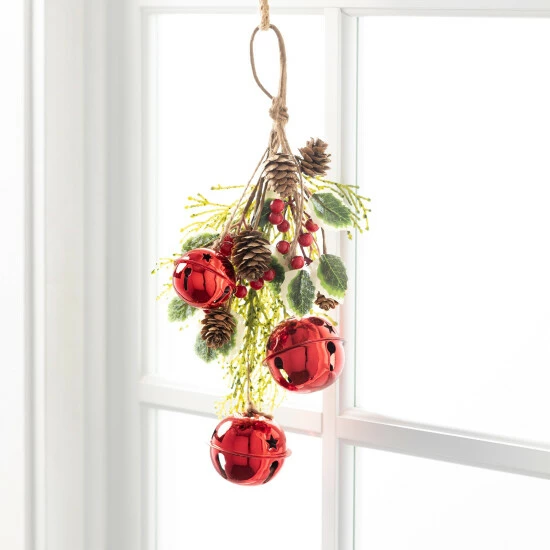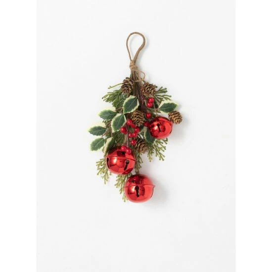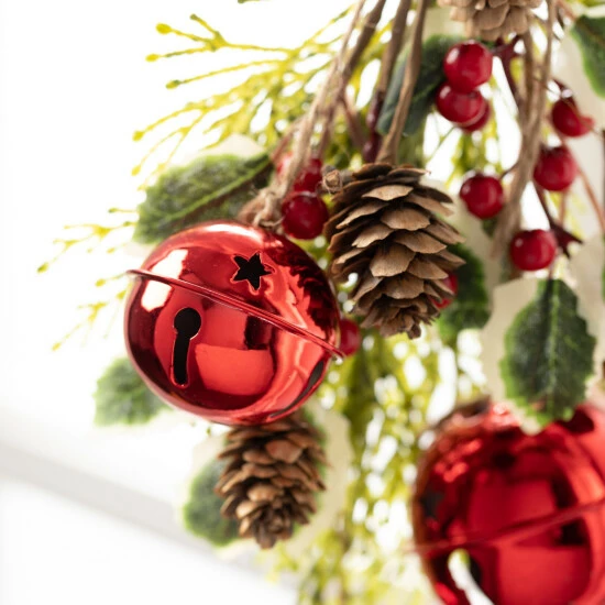 Festive and colorful for the Christmas season, this decorative swag is fully dressed and ready to be hung. A bundle of branches featuring pine, cones, leaves, berries, and bells are wrapped together and tied with a simple jute rope.