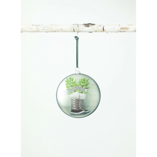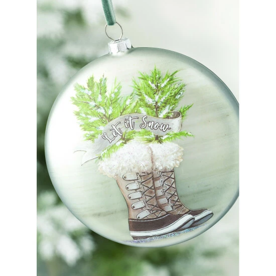 An elegant glass disc ornament with a soft metallic sheen and a velvet ribbon for hanging. The snow frosted pine bough and winter boots image with its message of “Let it Snow” is a beautiful addition to a natural or eclectic theme.