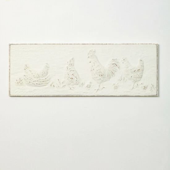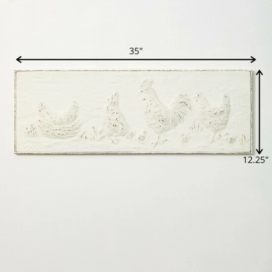 Illustrating a casual country feel, this 35″ x 12.25″ metal wall piece will look right at home in your coop. A captivating patterned scene of chickens, depicts an easygoing approach that is perfect for the kitchen. Over the last 52 years, Sullivans has become an industry leader in home decorations. Our brand is rooted in tradition while incorporating modernized trends to keep your home looking up to date with timeless style. Here at Sullivans, we pride ourselves on creating product designs focused on quality and value, ensuring that our customers have access to beautiful products at reasonable price points.