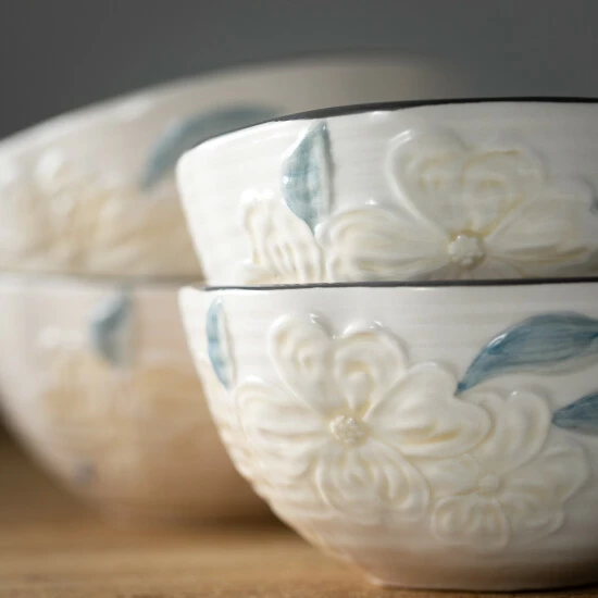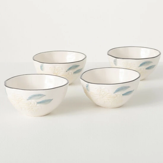 Distinctive, with a hand-thrown pottery appeal, this set of four 5″ bowls will add true sophistication to the menu. Sculpted in a relief pattern with hand-painted details, this collection features Sullivans exclusive dogwood artwork. Over the last 52 years, Sullivans has become an industry leader in home decorations. Our brand is rooted in tradition while incorporating modernized trends to keep your home looking up to date with timeless style. Here at Sullivans, we pride ourselves on creating product designs focused on quality and value, ensuring that our customers have access to beautiful products at reasonable price points.