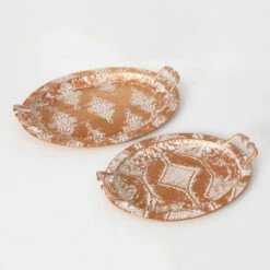This set of two gold and whitewashed embossed trays add a classy vibe to your Christmas decor. Fill them with pinecones, ornaments, or greenery, or display them as-is. They measure 18″ and 22″ long, respectively. Over the last 52 years, Sullivans has become an industry leader in home decorations. Our brand is rooted in tradition while incorporating modernized trends to keep your home looking up to date with timeless style. Here at Sullivans, we pride ourselves on creating product designs focused on quality and value, ensuring that our customers have access to beautiful products at reasonable price points.