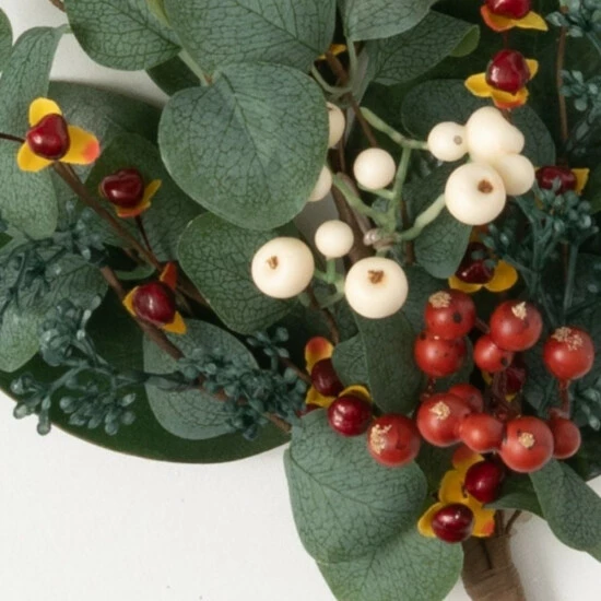Decorate your table with this warm, artificial arrangement from Sullivans. The green eucalyptus leaves are brightened up with white, red, and orange berries for a pleasing palette that is perfect for fall and winter. Display this easy-care piece in your favorite vase for a custom look.