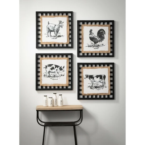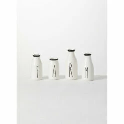 Crafted from dolomite, these white cream bottles each have a black-lined rim and a letter, when combined spells Farm”. They vary in height from 3.5″ – 5.5″. Watertight.”