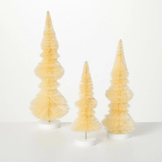 - Set features 3 cream bottle brush trees on wood bases