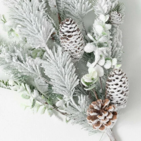 Flocked to total perfection, this snow-covered collection looks fresh from the outdoors. Every component of this beautiful compilation is layered in faux snow – the pine, the greens, the cones – and it all looks completely stunning. There’s plenty of texture and dimension to this array of greens.
