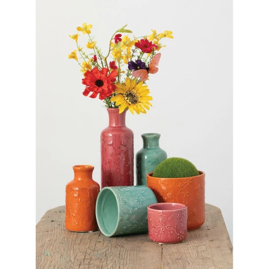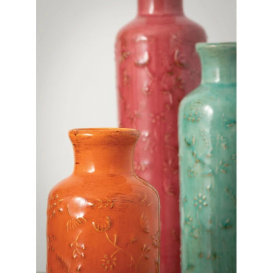 Add a colorful, whimsical touch to your decor with this 3-piece bottle set. The ceramic bottle set comes with three sizes in three different colors, each embossed with a cheerful floral design. Perfect for brightening up your space, the bottles can be displayed together or separately, and are perfect for displaying your favorite faux flowers.