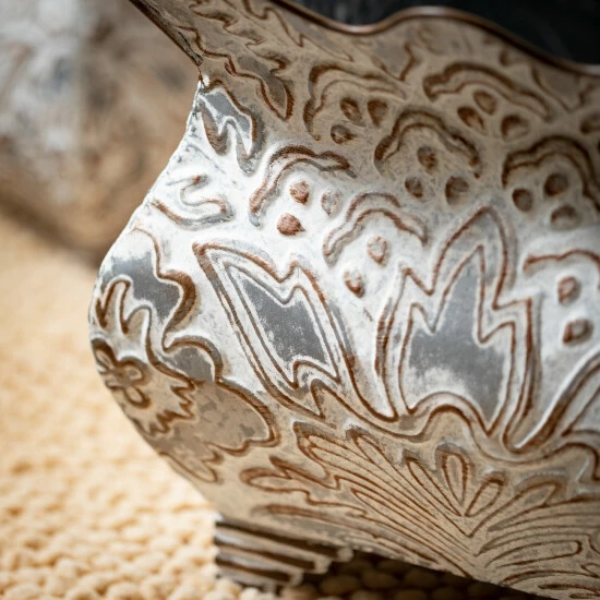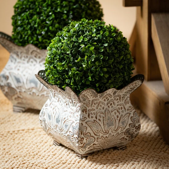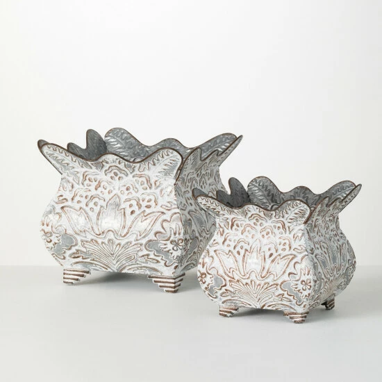 Stunning with Sullivan’s exclusive embossed flourish pattern, this pair of planters comes in an 8″ and 10″ heights. The unique scalloped edges along the opening add a touch of individualism, quintessential to the design of this metal set of two. Exclusive “exploded artichoke” pattern. Over the last 52 years, Sullivans has become an industry leader in home decorations. Our brand is rooted in tradition while incorporating modernized trends to keep your home looking up to date with timeless style. Here at Sullivans, we pride ourselves on creating product designs focused on quality and value, ensuring that our customers have access to beautiful products at reasonable price points.