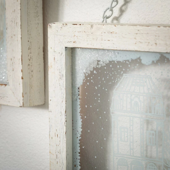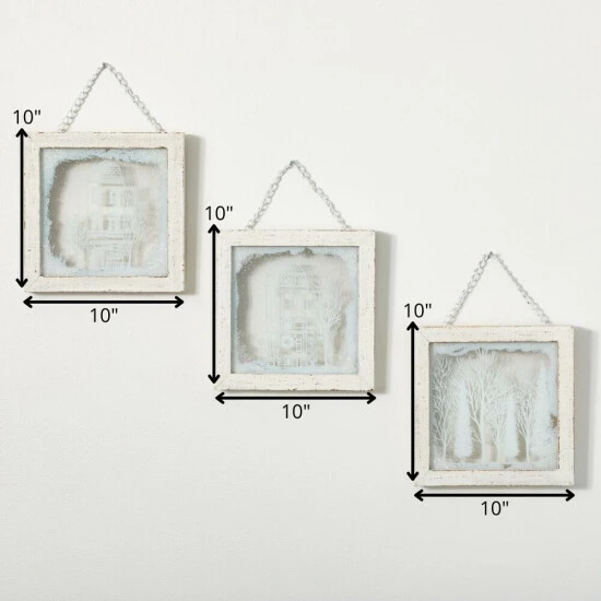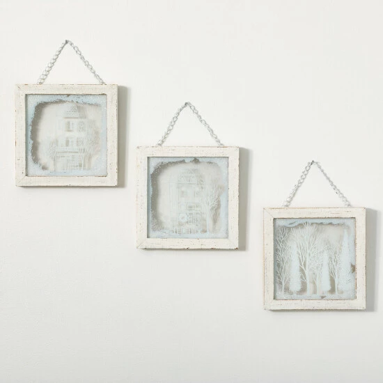 Framed in a simple white frame, the glass triptych panels of this hanging wall decor is accentuated with Sullivans very own exclusive artwork. Square in size, each of the trio set displays a winter village scene with a look resembling a hand-drawn finish on a frosty window. Over the last 52 years, Sullivans has become an industry leader in home decorations. Our brand is rooted in tradition while incorporating modernized trends to keep your home looking up to date with timeless style. Here at Sullivans, we pride ourselves on creating product designs focused on quality and value, ensuring that our customers have access to beautiful products at reasonable price points.