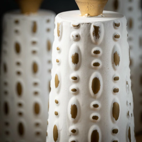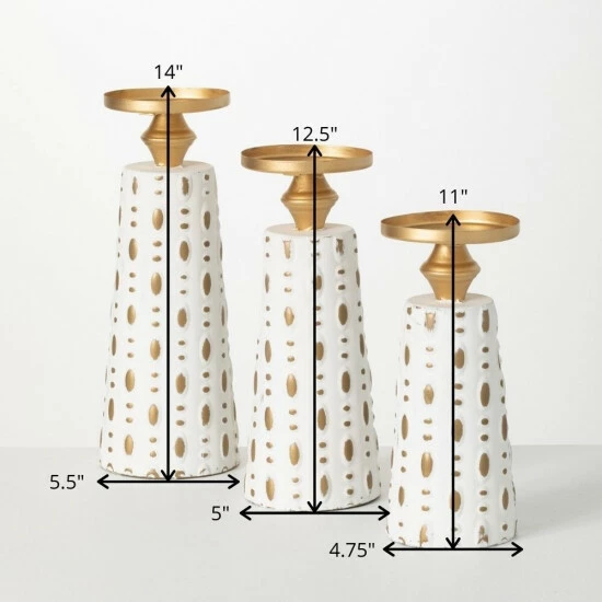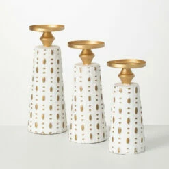 Featuring an artisanal casted base, these three candleholders are really a sight to be seen. Alternating in height from 11″ to 12.5″ to 14″, this trio of metal forms has a unique pattern embossed in the base structure. With a soft-brushed gold and cream-colored finish, they are the perfect way to put pillar candles on display. Over the last 52 years, Sullivans has become an industry leader in home decorations. Our brand is rooted in tradition while incorporating modernized trends to keep your home looking up to date with timeless style. Here at Sullivans, we pride ourselves on creating product designs focused on quality and value, ensuring that our customers have access to beautiful products at reasonable price points.