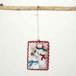 Proudly receiving our stamp of approval, this postage-style, scalloped edge disc ornament showcases an adorable snowman family scene. Hand-painted on beautiful mercury glass, the rectangular shape of this piece will look amazing on the tree. Over the last 52 years, Sullivans has become an industry leader in home decorations. Our brand is rooted in tradition while incorporating modernized trends to keep your home looking up to date with timeless style. Here at Sullivans, we pride ourselves on creating product designs focused on quality and value, ensuring that our customers have access to beautiful products at reasonable price points.