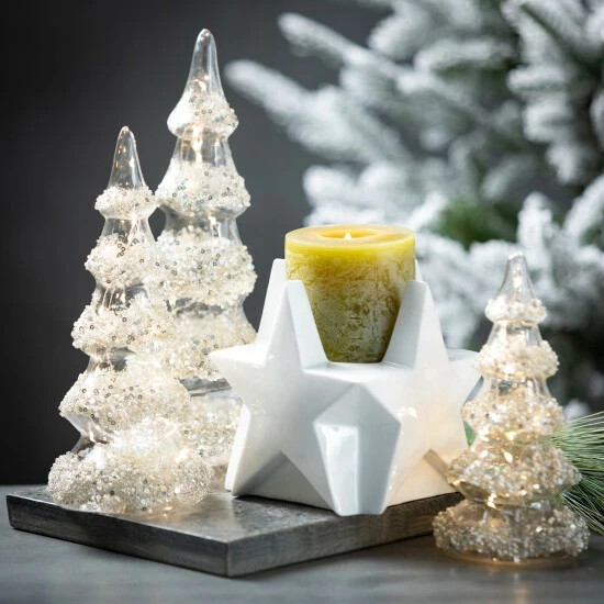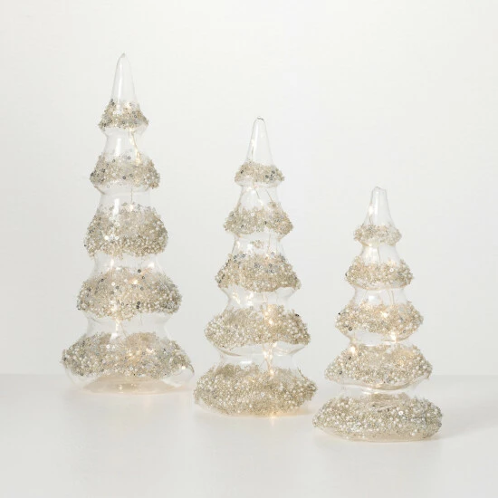This glass trio of lighted Christmas trees will add some elegance to your Holiday decor. Measuring 7.5″, 9.5″, and 11.5″ inches, these trees are encrusted with silver and gold glitter for an upscale look. Display them on a shelf or mantle, or add them to a centerpiece with greenery. Over the last 52 years, Sullivans has become an industry leader in home decorations. Our brand is rooted in tradition while incorporating modernized trends to keep your home looking up to date with timeless style. Here at Sullivans, we pride ourselves on creating product designs focused on quality and value, ensuring that our customers have access to beautiful products at reasonable price points.