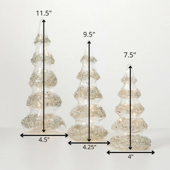 - Trees measure 4.5″L x 4.5″W x 11.5″H; 4.25″L x 4.25″W x 9.5″H; 4″L x 4″W x 7.5″H