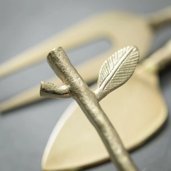- This set of gold serving pieces feature unique twig and leaf handles