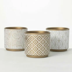 Patterns are a plenty with this refined collection of gold and white cement basins. A sophisticated accent to any plant or botanical, these three 6″ tall pots will look stunning alone, and even better when filled with whatever you desire. Over the last 52 years, Sullivans has become an industry leader in home decorations. Our brand is rooted in tradition while incorporating modernized trends to keep your home looking up to date with timeless style. Here at Sullivans, we pride ourselves on creating product designs focused on quality and value, ensuring that our customers have access to beautiful products at reasonable price points.