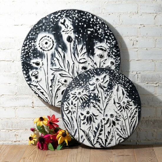Bring a little charm and delight to your space with this set of two hanging medallions. Crafted of metal and beautifully embossed with a grand floral design, this pair that measures 18″ and 23″ in diameter respectively, will have a commanding presence wherever they go. Over the last 52 years, Sullivans has become an industry leader in home decorations. Our brand is rooted in tradition while incorporating modernized trends to keep your home looking up to date with timeless style. Here at Sullivans, we pride ourselves on creating product designs focused on quality and value, ensuring that our customers have access to beautiful products at reasonable price points.