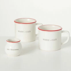 - White & red mug set featuring holiday text will add extra cheer to your holiday festivities
