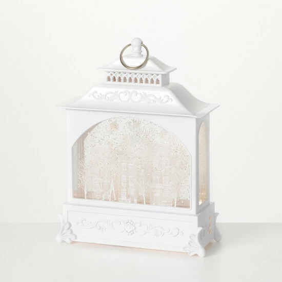 - White lantern features a painted winter cityscape and has a snow globe appearance with floating glitter