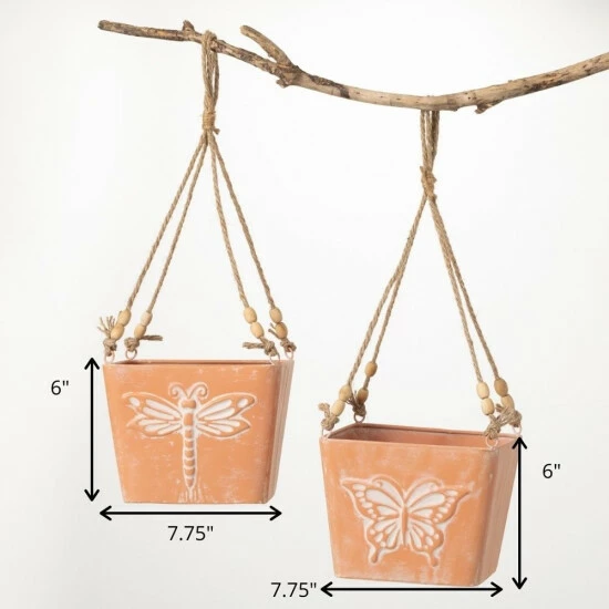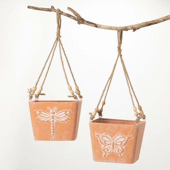 Fitting for the garden, covered porch, or interior of the home, this pair of coordinating hanging planters adds just the right amount of whimsy. The fronts each feature either the dragonfly or butterfly, and are crafted of metal with a faux terracotta finish that is brushed with a touch of whitewashing. Over the last 52 years, Sullivans has become an industry leader in home decorations. Our brand is rooted in tradition while incorporating modernized trends to keep your home looking up to date with timeless style. Here at Sullivans, we pride ourselves on creating product designs focused on quality and value, ensuring that our customers have access to beautiful products at reasonable price points.
