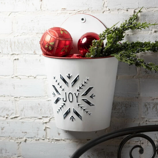 Store your Christmas letters and holiday cards in these festive metal wall pockets. A perfect pair, these white painted containers feature red trimming and an embossed snowflake design featuring the word “Joy.” They measure in at 11.75″ and 13.75″ in height.