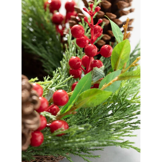 Bursting with classic red and green spirit, this juniper berry wreath features giant pine cones and bursts of berries for a look that captures the feeling of Christmas. Measuring 16 high by 16″ wide, this is the perfect size for any home.”