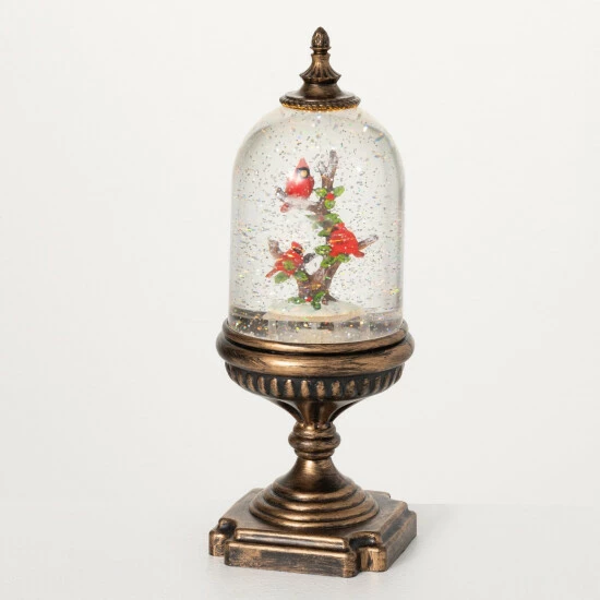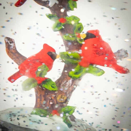 - This shimmer dome features red cardinals surrounded by floating glitter