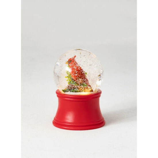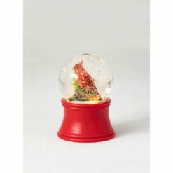 This quaint and charming snowglobe encompasses an adorable polyresin red cardinal figurine and stands 4″ around and 5.5″ tall. The globe rests beautifully on a painted red base.