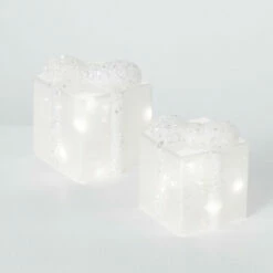 These lighted Christmas packages make the perfect Holiday accent. Embellished with glitter, these frosted white glass gifts give off a beautiful glow when lit. They measure 4″ and 4.75″ high, and make a wonderful addition to any Christmas decor. Over the last 52 years, Sullivans has become an industry leader in home decorations. Our brand is rooted in tradition while incorporating modernized trends to keep your home looking up to date with timeless style. Here at Sullivans, we pride ourselves on creating product designs focused on quality and value, ensuring that our customers have access to beautiful products at reasonable price points.