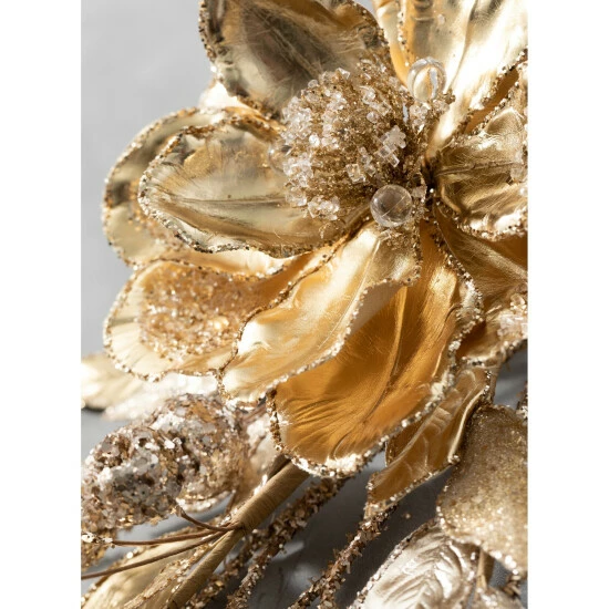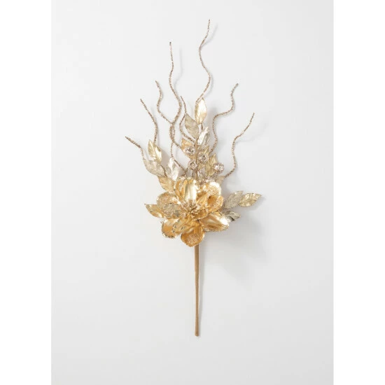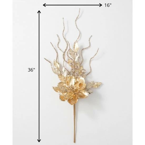 Showcasing stunning hand-applied glitter and beautiful beadwork, this 36″ magnolia and berry spray features a rich mix of metallic polyester elements. Each piece is detailed with wavy sprigs, shiny berries, sparkling foliage and one blooming magnolia flower at the center.