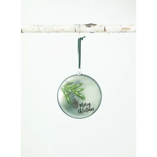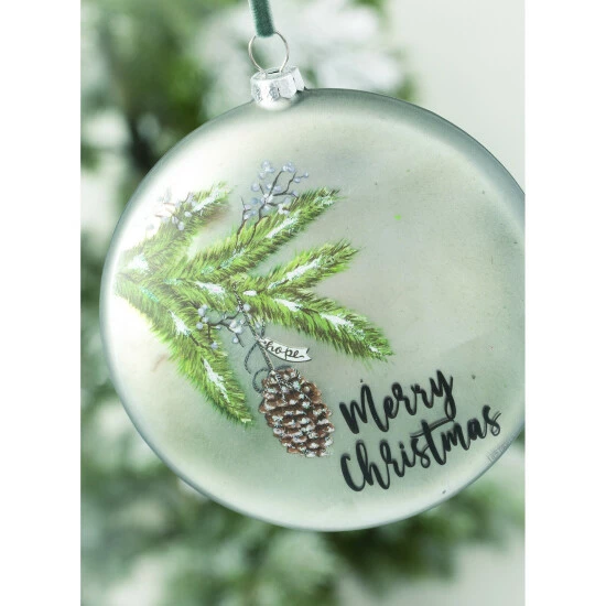 Say Merry Christmas with this elegant glass disc ornament, with its soft metallic sheen and velvet ribbon for hanging. The snow frosted pine bough and cone image with its message of hope is a beautiful edition to a natural or eclectic theme.