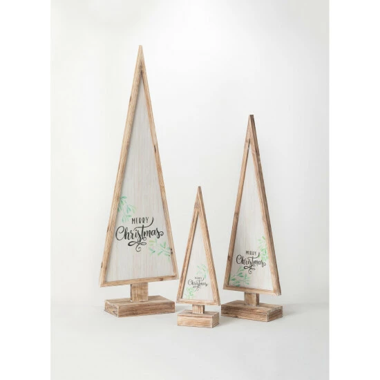 A true delight for a tabletop, shelf, or mantle, this trio of wood-trimmed tree shapes brings the spirit alive with style. Towering at heights of 24″, 36″, and 48.25″, this group features a whitewashed finish and scripted “Merry Christmas” sentiments.