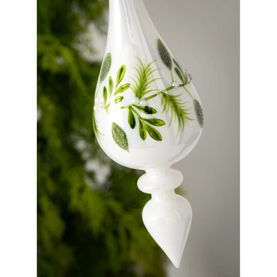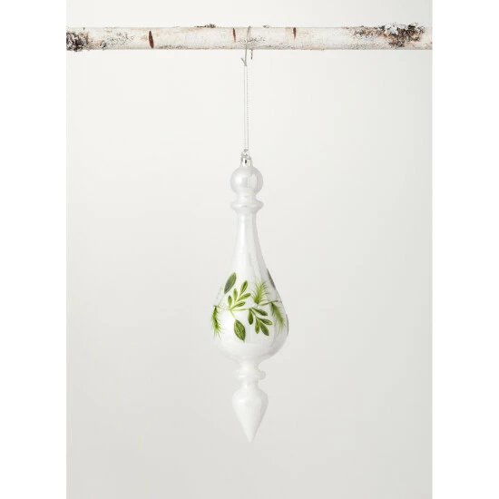 A traditional glass finial gets an update with hand-painted mistletoe artwork, mini pearl adornments, and frosted glass accents. A shepherd hook top and silver cord for hanging completes this breathtaking ornament.