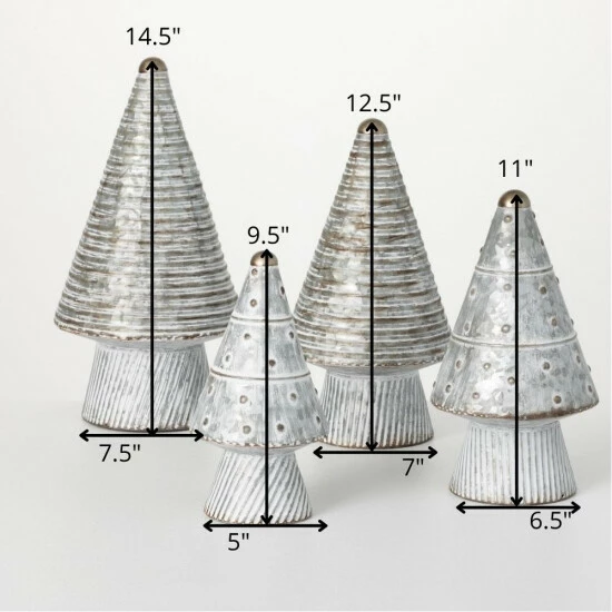 - Trees measure 7.5″L x 7.5″W x 14.5″H; 7″L x 7″W x 12.5″H; 6.5″L x 6.5″W x 11″H; 5″L x 5″W x 9.5″H