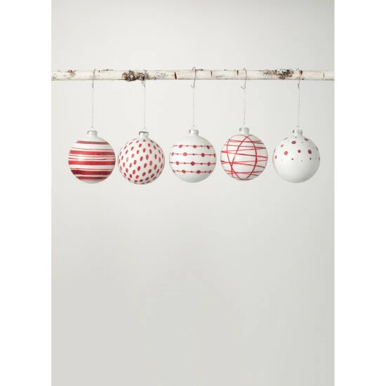 These frosted finished white round ball ornaments are both simple and striking when placed together in proximity. Holiday red lines, dots, and patterns cover them to create a fun-loving collection for all ages. Over the last 52 years, Sullivans has become an industry leader in home decorations. Our brand is rooted in tradition while incorporating modernized trends to keep your home looking up to date with timeless style. Here at Sullivans, we pride ourselves on creating product designs focused on quality and value, ensuring that our customers have access to beautiful products at reasonable price points.