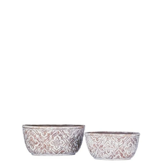 Etched with ornamental markings, these cement containers serve as magnificent patio and garden planters. The distressed finish simulates clay pottery created by skilled artisans, while the size and shape make them an ideal terra cotta solution for many uses. Terracotta, clay, and even concrete have unique properties of being sustainable, safe, durable and versatile enough for every style!