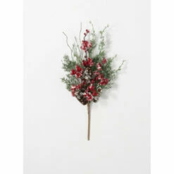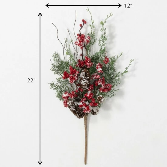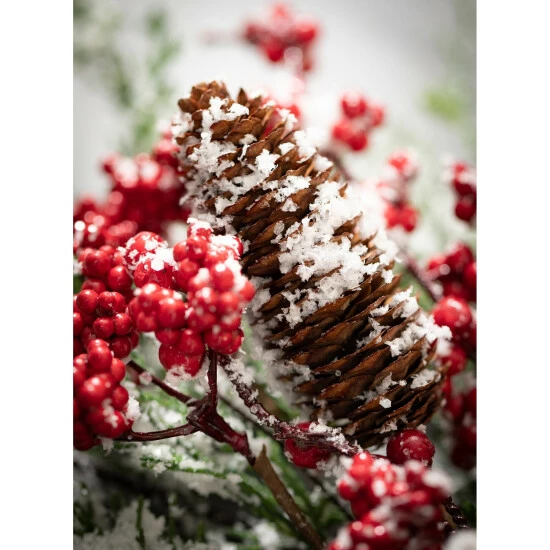 With a generous dusting of faux snow, this 22″ tall spray features everything you need for holiday decorating – pine and cones, all accented with red berries. Full and hearty, this piece looks great in a collection or on its own.
