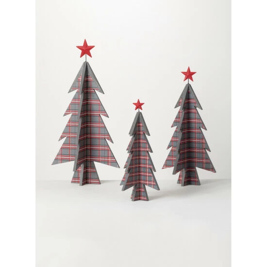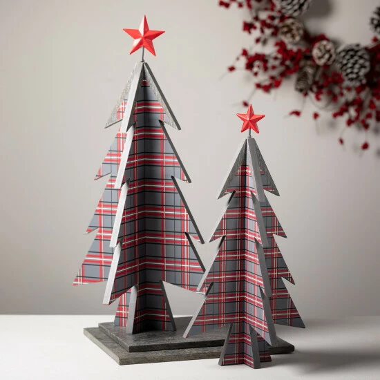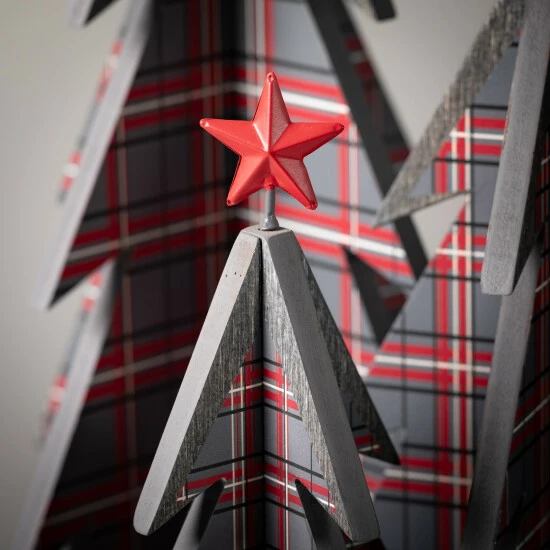 Dimensional with a modern touch of classic plaid pattern, this trio of wooden trees are a fun way to decorate a shelf for the season without overdoing the classic red and green. Measuring 17″ to 26.25″ tall, they are a simple decoration that fits in anywhere.