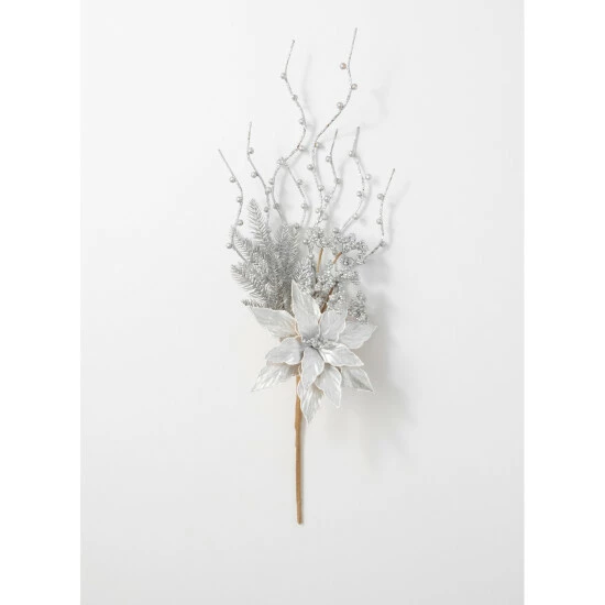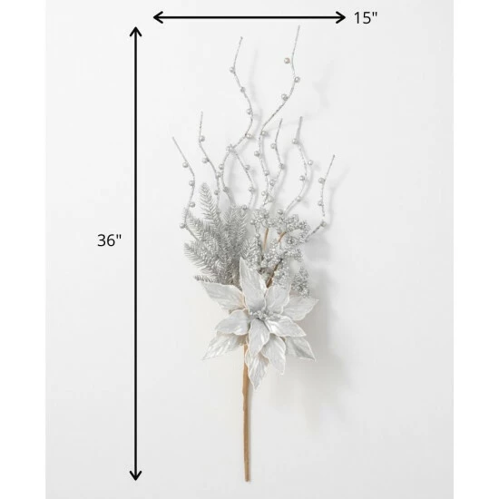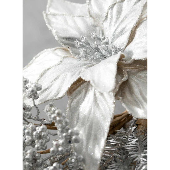 Covered in shimmering silver polyester, this glitter-trimmed poinsettia rests in the middle of a bouquet of iced foliage, berries and twigs. The piece stands 36″ tall.
